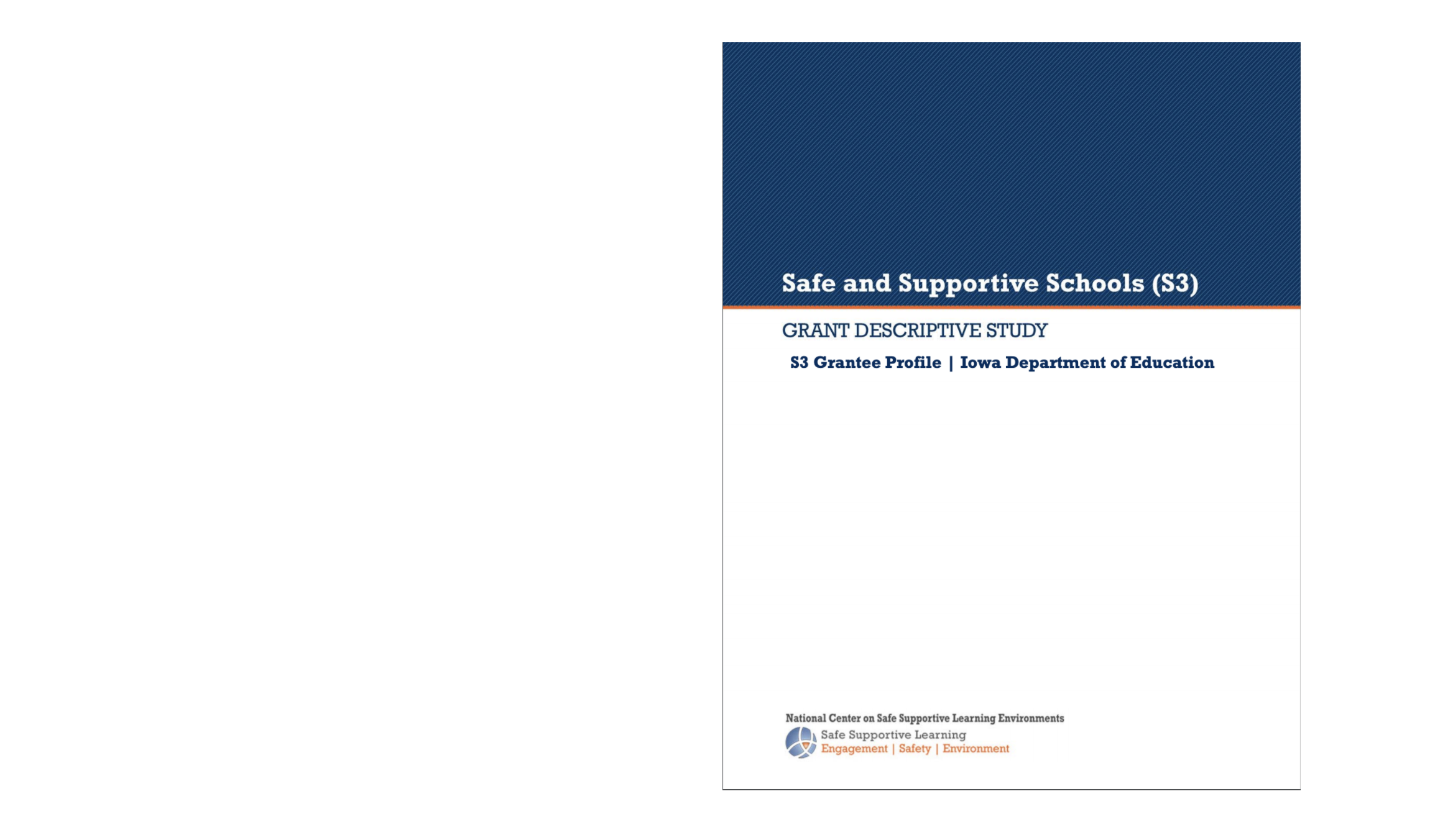 Iowa Safe and Supportive Schools (IS3 ) was a federal grant that sought to understand the optimal conditions for learning and provided financial support for select schools to leverage resources toward maximum benefit for students, their families and the school personnel who support them.